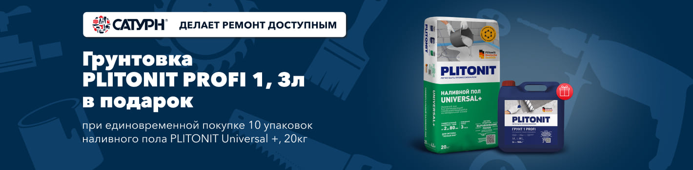 При единовременной покупке 10 упаковок наливного пола PLITONIT Universal+ (20кг), Вы получаете 1 упаковку грунтовки PLITONIT PROFI 1 (3л) в подарок!