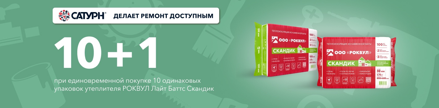 При единовременной покупке 10 одинаковых упаковок утеплителя РОКВУЛ Лайт Баттс Скандик, 1 аналогичный товар Вы получаете в подарок!