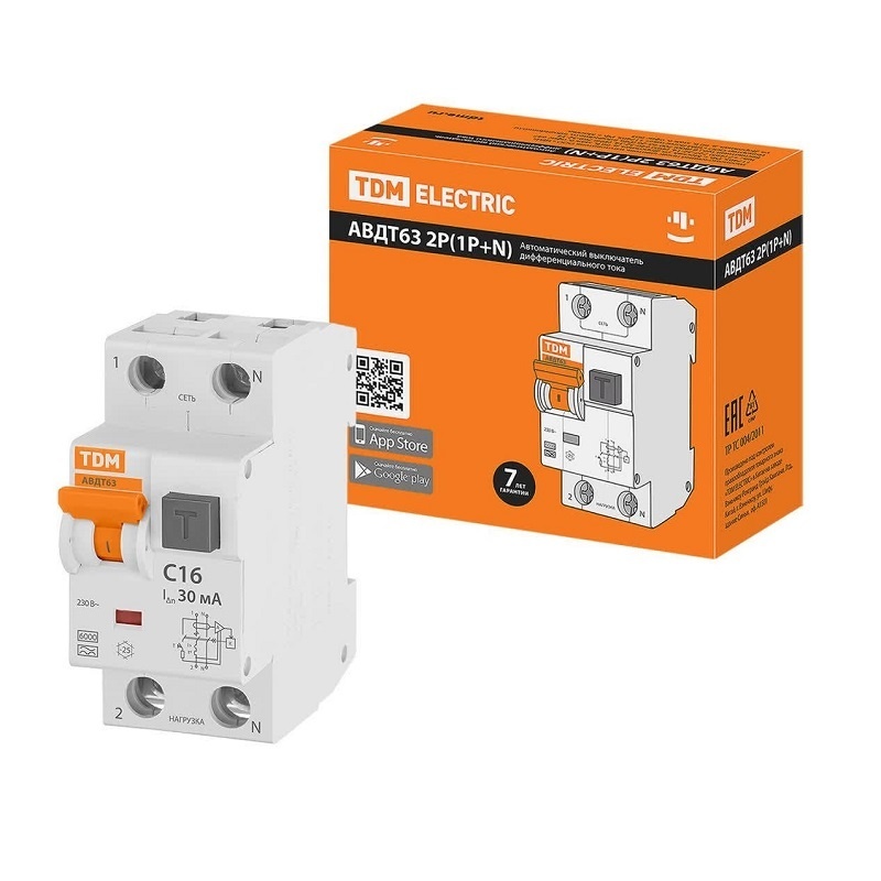 Автомат дифференциальный TDM АВДТ 63 6кА, С 16А, 30мА, тип А, 1P+N