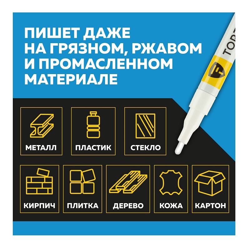 В строительном магазине Сатурн можно купить товар "Маркер лаковый Topfort Paint белый 2 мм" по цене от 152 руб с доставкой за 2 часа по Казани или оформить самовывоз.